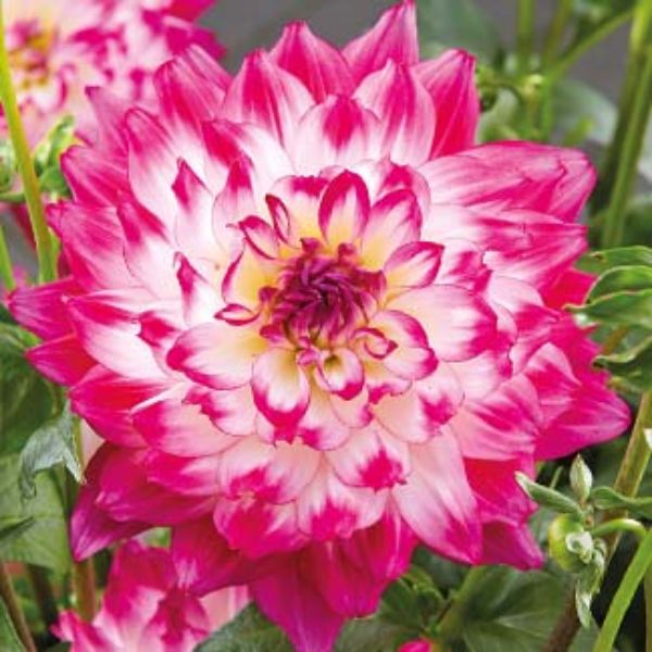 A stunning patio type dahlia with 5″ rose and white bicolor blooms. Will flower all season long.