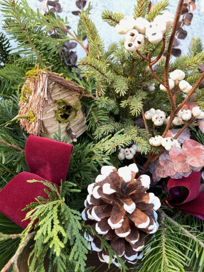 The evergreens in this 15″ box are accented in with burgundy velvet ribbon, white permanent berries, frosted pinecones, mahogany pods, oregonia and plum colored eucalyptus. Coordinates with our Forest Elegance pot.