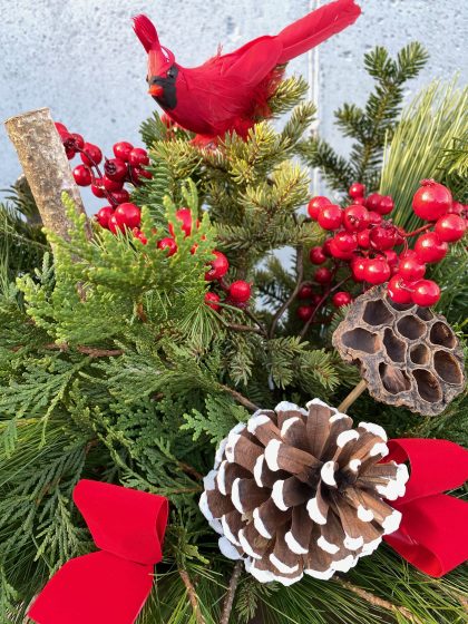 Perfect for dropping in your window boxes or setting on a table, we've filled this 15″ box with evergreen boughs and then added a birch pole, frosted pinecones, a red berry stem, cardinal lotus pods and a red cardinal.