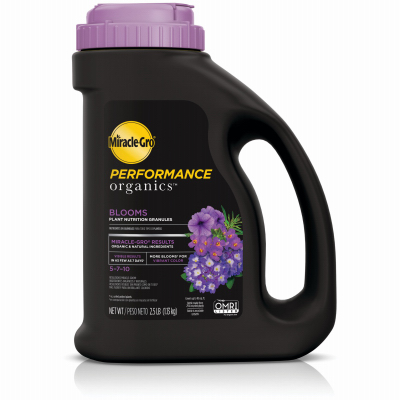2.5 lb Miracle-Gro Performance Organics Bold Blooms Plant Nutrition, 5-7-10, For In Ground & Container Flowering Plants. OMRI Listed. Reapply every 4 To 6 Weeks with the easy to use shake bottle.