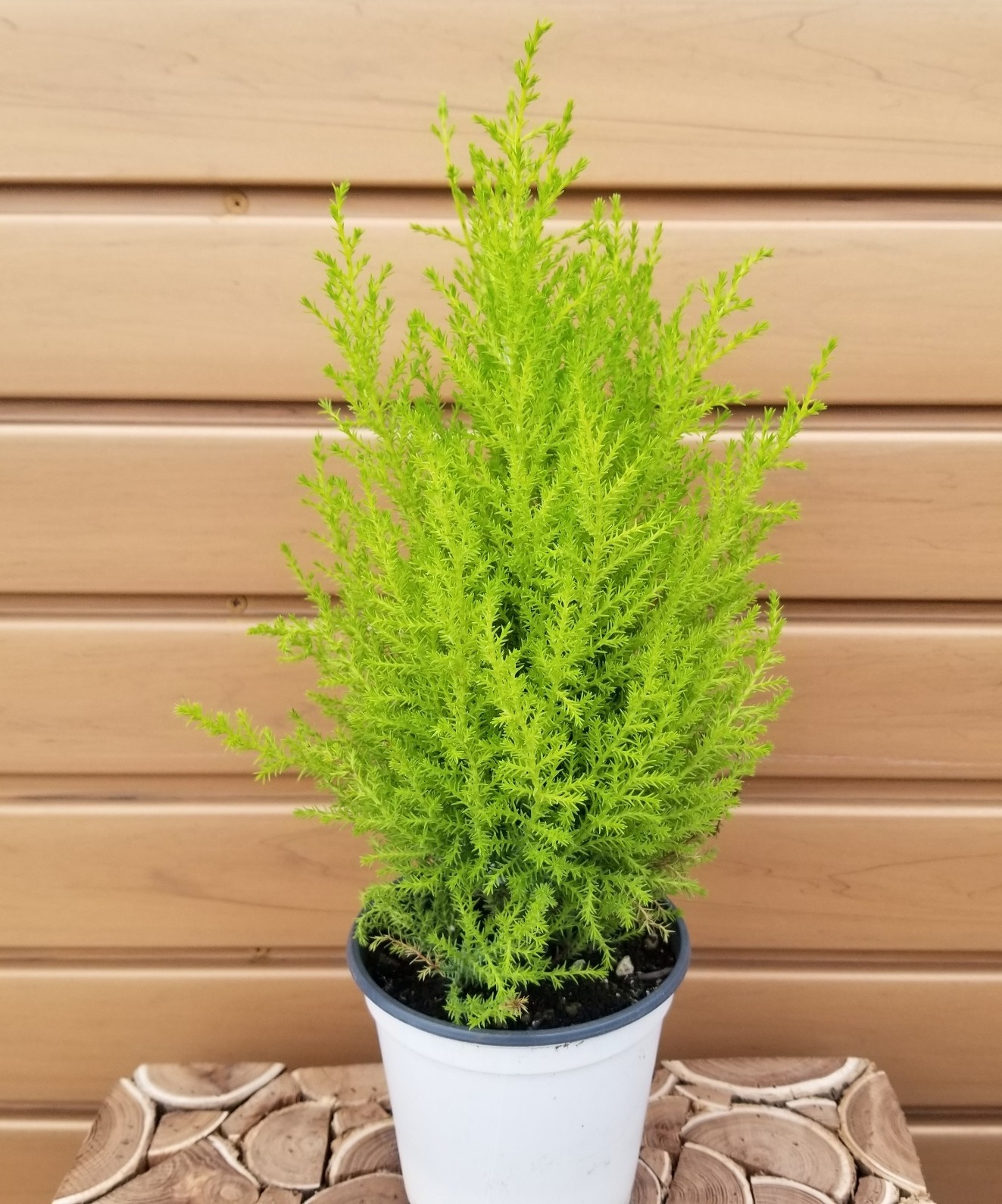 Cypress 'Goldcrest' or lemon cypress tree has green-yellow, needle-like foliage, conical growth pattern, and bright fresh citrus smell.