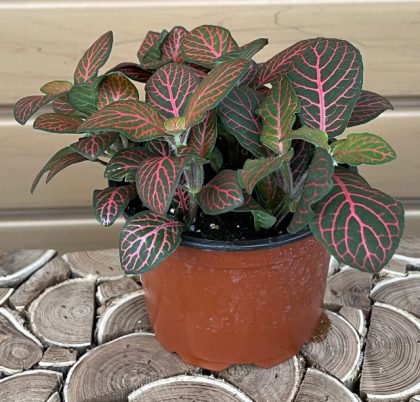 Fittonia or Nerve plant (Mosaic plants) is a low growing creeper suitable for terrariums or bottle gardens due to its high humidity requirements. Keep away from direct sun to avoid leaf burn. North window or fluorescent lights will work. Keep soil moist and mist the leaves.