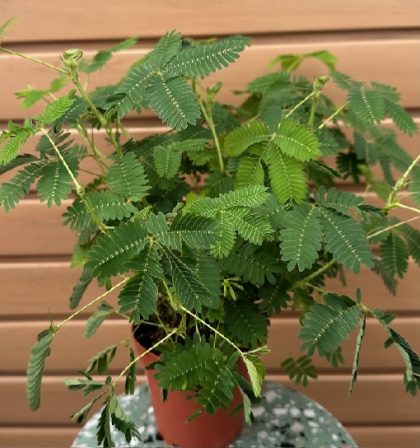 Also called sensitive plant; its compound leaves fold inward to hug the stem when they are touched. After a few minutes the plant go back to normal. It produces pink puff ball flowers. Very popular among kids due to its interactive nature.