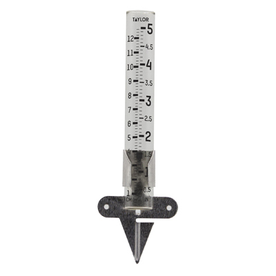 5″ Capacity, Glass Rain Gauge, Bold, Easy To Read Black Graphics, Metal Spike To Mount Into Ground.