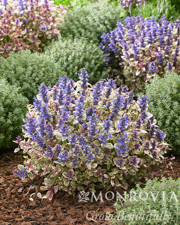 Gorgeous, cream-purple foliage with glowing pink edges becomes covered in royal blue flower spikes in spring, often lightly repeating in late summer. This unique perennial forms a tight, cushion-like clump; does not invade as common Ajuga can. Ideal for mass planting as groundcover or border edging.