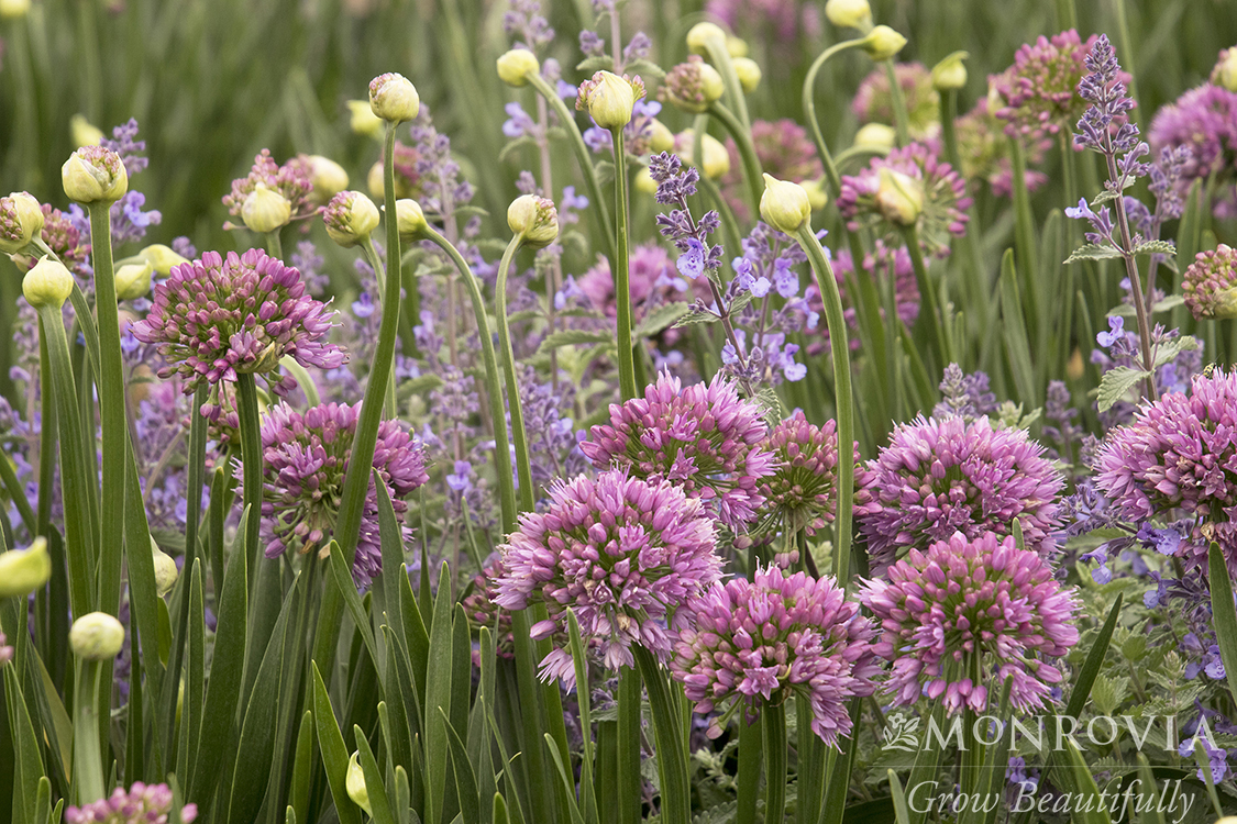 A profusion of large 2-inch round, bright, rosy purple flower clusters appear on strong upright stems. Forms a picture perfect, compact clump of glossy green, thick, grass-like leaves. The bold blooms are a wonderful addition to sunny gardens. An exquisite cut flower, fresh or dried.
