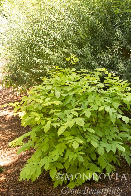 A sensational tall accent for a semi-shaded border or woodland garden. Each spring, brilliant yellow foliage emerges from a broad clump to create a grand, tree-like display. In late summer, sprays of white flowers climax in fireworks of shiny purplish black berries.