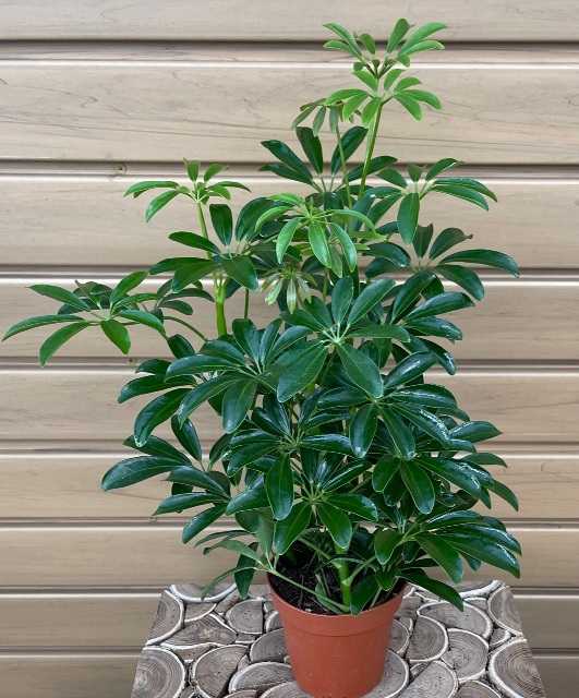 Arboricola or umbrella plant is an easy to grow houseplant. It will grow to 3 ft. tall and 2.5 ft. wide. It will do well in a wide variety of light conditions but will do best in bright to medium light. Fertilize twice a year during spring and summer. Toxic to pets and kids. Purifies the air.