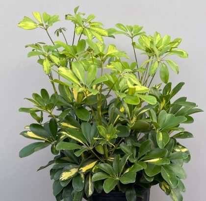 Arboricola or umbrella plant is an easy to grow houseplant. It will grow to 3 ft. tall and 2.5 ft. wide. It will do well in a wide variety of light conditions but will do best in bright to medium light. Fertilize twice a year during spring and summer. Toxic to pets and kids. Purifies the air.