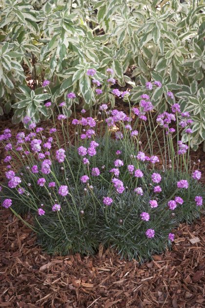 Red Leaf Thrift. A profusion of rose pink flower heads dance above neat mounds of red-tinged evergreen foliage. Finely textured leaves develop a bronze hue in cool weather. Dependable border or pathway edging. Great evergreen for rock garden or landscape accents. An herbaceous perennial.