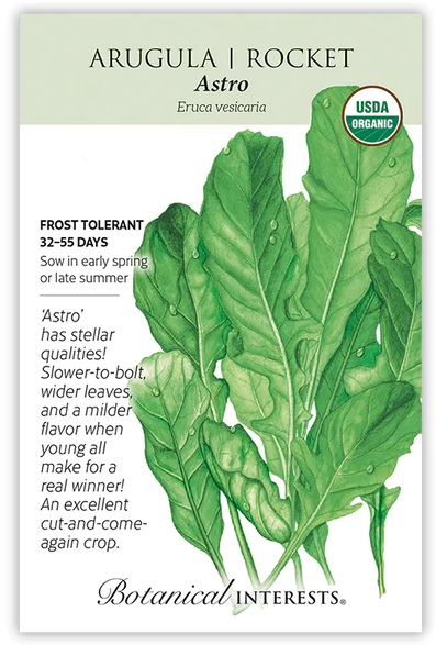 Because 'Astro' has wider leaves and is slower-to-bolt than other arugulas, you will be enjoying more leaf per harvest and a longer harvest period. With its milder flavor, it makes a delectable baby green, harvestable in just about a month! The peppery flavor many of us love ramps up over time and as spring temperature heats up. Afternoon shade helps prolong the harvest. Also a good container variety.
