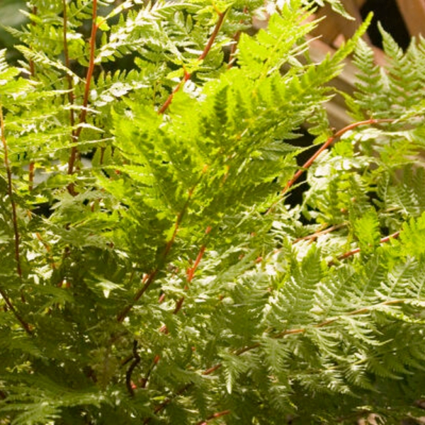 Finely textured light green foliage held on vividly contrasting red-violet stems, Lady in Red typically grows slightly smaller than other fern varieties. Combine with bold-leaved plants in the shade or woodland garden such as hostas and brightly colored heucheras