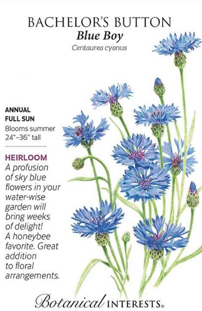 With dazzling, sky-blue flowers, 'Blue Boy' is wonderful in mass, and because it is drought tolerant, it's practically care free. Flowers can be used dried or fresh cut, while the edible petals make a colorful garnish to salads, crudités platters, or dinner plates. Also known as cornflower, bachelor's button will “naturalize”, or self-sow, for another crop of blue flowers next year.