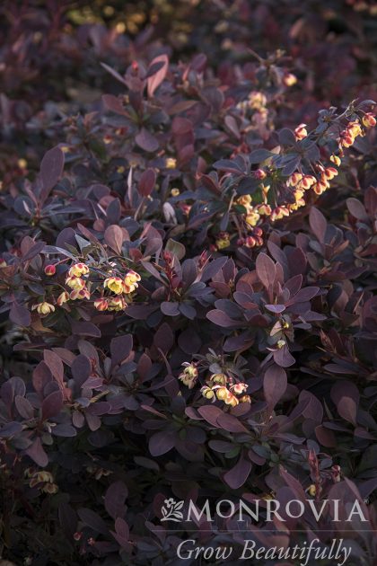 Lava Nugget® Barberry. A compact, large-leaved barberry with bright orange-red new foliage that ages to a deep burgundy. Small yellow flowers appear in spring. The warm, rich color pairs beautifully with green or gold-leaved plants. Excellent for mass plantings, a low hedge or accent plant. Rust resistant. Deciduous.