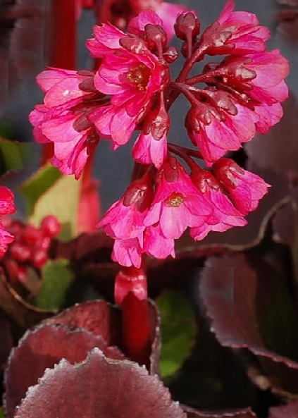A bold, low-growing rosette of large, glossy green leaves sends up an abundant display of rosy-red flowers on sturdy red stems. This easy-care, shade-loving perennial works perfectly in the foreground of a woodland garden. An herbaceous perennial.