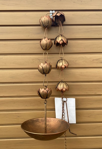 The Blossom Rain Chain is designed to be hung from a roof or gutter. It is made of iron and measures 102 inches long.