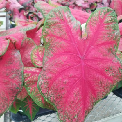 Caladium is a bulb plant with large colorful leaves. Often called elephant ears. Keep evenly moist but not soggy in a shadier spot. Great for shade container combinations as a specimen plant. They don't need too much fertilizer. Sensitive to cold.