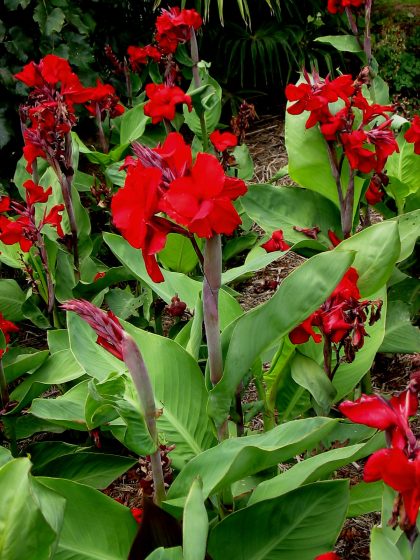 Vibrant clusters of deep red flowers bloom atop rich green foliage. This showy tropical adds vertical interest and color to a summer landscape or container garden.