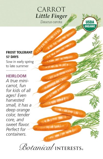 Did you know that grocery store baby carrots are actually cut from regular sized carrots? Once you try the sweet flavor and crisp bite of this 3″ long, true baby carrot, you will never look back! Though it tastes great fresh from the garden, 'Little Finger' was developed in France for pickling and canning whole.