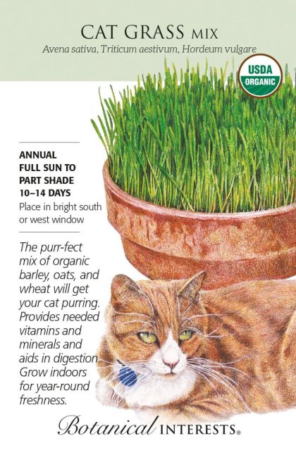 Even cats need their greens! This organic barley, oats, and wheat blend is rich in antioxidants, vitamins, minerals, and amino acids. Not only does cat grass help in digestion by moving the hairballs along, but it gives them a shiny coat and freshens breath! Because it's grown indoors, cat grass can be served year-round at its peak of freshness. Grass is ready to eat in as little as 2 weeks! Safe for dogs, too!