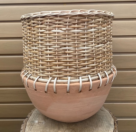 The Catalonia planter is made of terracotta on the bottom half and basket weave on the top half. It measures 12.5 inches wide and 13.5 inches tall.
