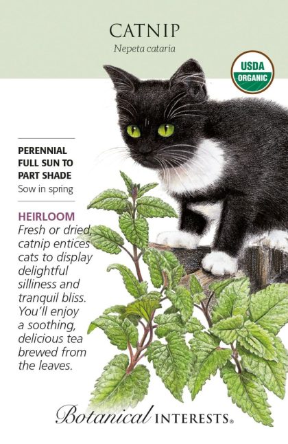 Catnip is a multi-purpose plant. The tea is very pleasant with a lemon-mint flavor and fragrance. Along with fresh catnip planted in containers indoors year-round, catnip toys filled with dried leaves will provide your feline friends with hours of fun. But be warned; they may ignore you for a while! Catnip is very hardy and grows in almost any soil; self-sows readily.