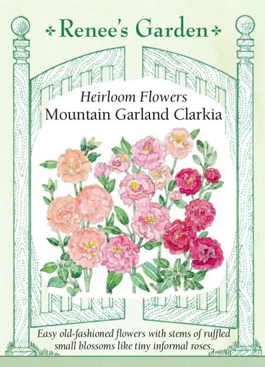 Native to the Pacific Northwest, easy growing Mountain Garland Clarkia is one of my favorite American wildflowers. The multiple flower stems are covered with ruffled ribbons of small blossoms, each shaped like tiny informal roses. These fluffy 2 to 3 foot tall wands of color fill the late spring garden in pretty soft shades of coral, salmon, rose-pink, lilac and pure white. Beautifully adapted to home gardens, the abundant graceful blooms are perfect for informal bouquets. Monet would have loved them in his Giverny gardens!