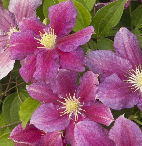 Striking large blooms with pale pink, undulating margins on velvety, red-violet petals profusely cover this more compact clematis variety. An early flowering variety that blooms in spring and again in late summer. A wonderful flowering vine for a trellis or fence. Ideal for small spaces. Deciduous.