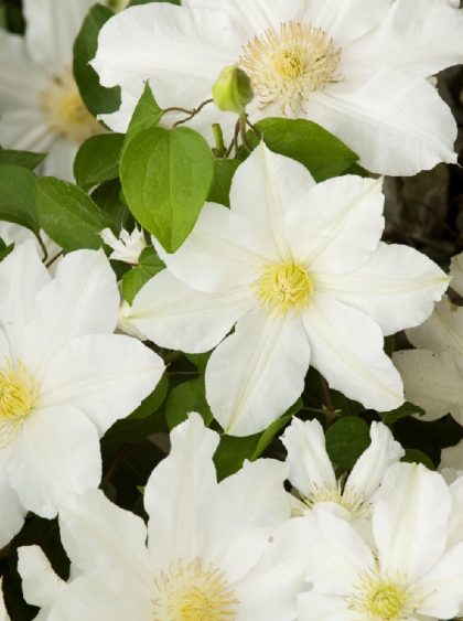 Large, pure white flowers with complementary delicate yellow stamens are among the earliest clematis blooms to appear. Plant against a dark background or allow to grow through dark-leaved plants for a splendid effect. Well-suited to small spaces. Deciduous.