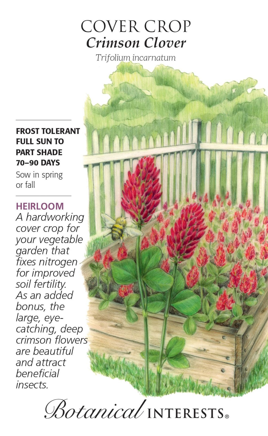 While the names are similar, crimson clover is different than red clover. This annual clover has larger, elongated flower heads with deep red, long-lasting blossoms that invite beneficial insects, such as ladybugs and bees. Like other clovers, crimson clover fixes nitrogen, but it's faster growing for quick benefits to your garden. Crimson clover grows best in cool weather, so grow it as a spring or fall cover crop. For maximum nitrogen, till, mow, or cut back with a weed trimmer at end of bloom and before seeds form. Grows in a variety of soils but does best if soil is well drained. Plants tolerate some shade so you can sow crimson clover in between rows or under tall plants, such as with corn or under fruit trees. A beautiful addition to fill spots in flower beds and borders. Flowers can be harvested and dried to make a delicious tea with a light, refreshing flavor.