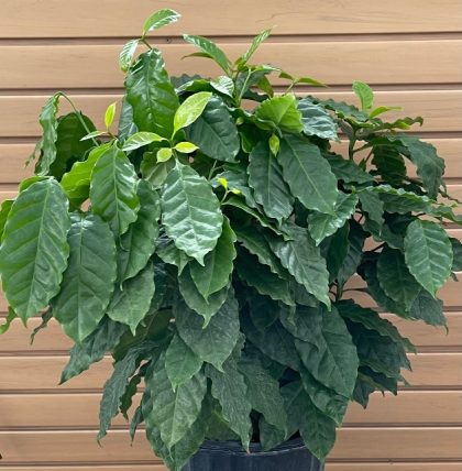 Coffee plants prefer bright, but indirect, light. The soil needs to stay moist, but not soaking wet. Coffee plants love high humidity. Placing on a pebble tray filled with water would be very helpfull for increasing humidity. Coffee plants can grow up to 6 feet. They will eventually flower when the plant matures, which can take three to five years. Even in the best of conditions, however, you can only expect a few flowers to form, but, if you hand pollinate them, they will produce the berries that contain coffee beans.