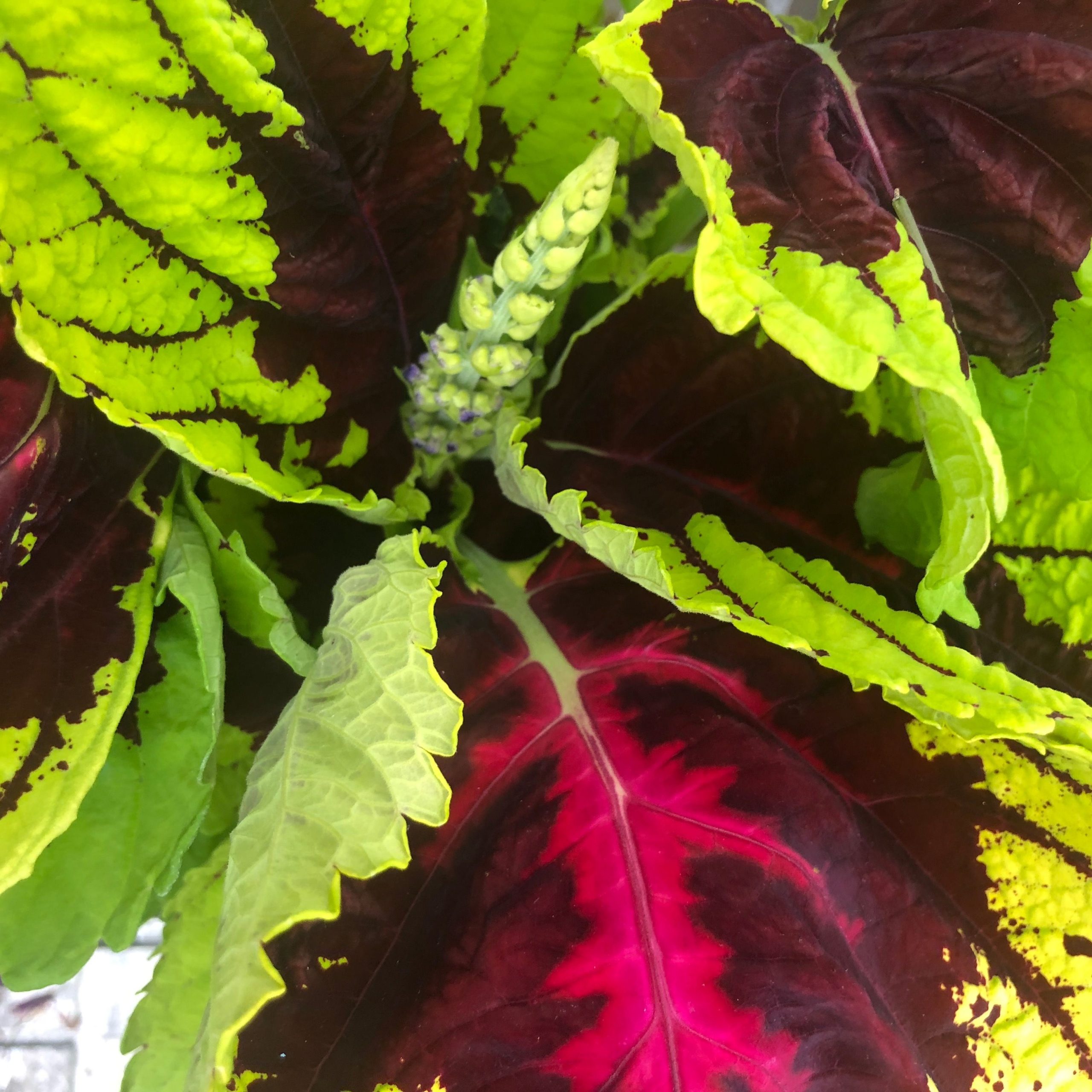 Huge rose colored foliage, adds interest to shade garden beds and containers.