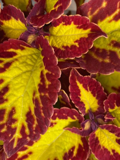 A bicolor coleus with chartreuse leaves and velvet maroon edges. Beautiful contrast. Great landscape performer or a combo planter thriller.