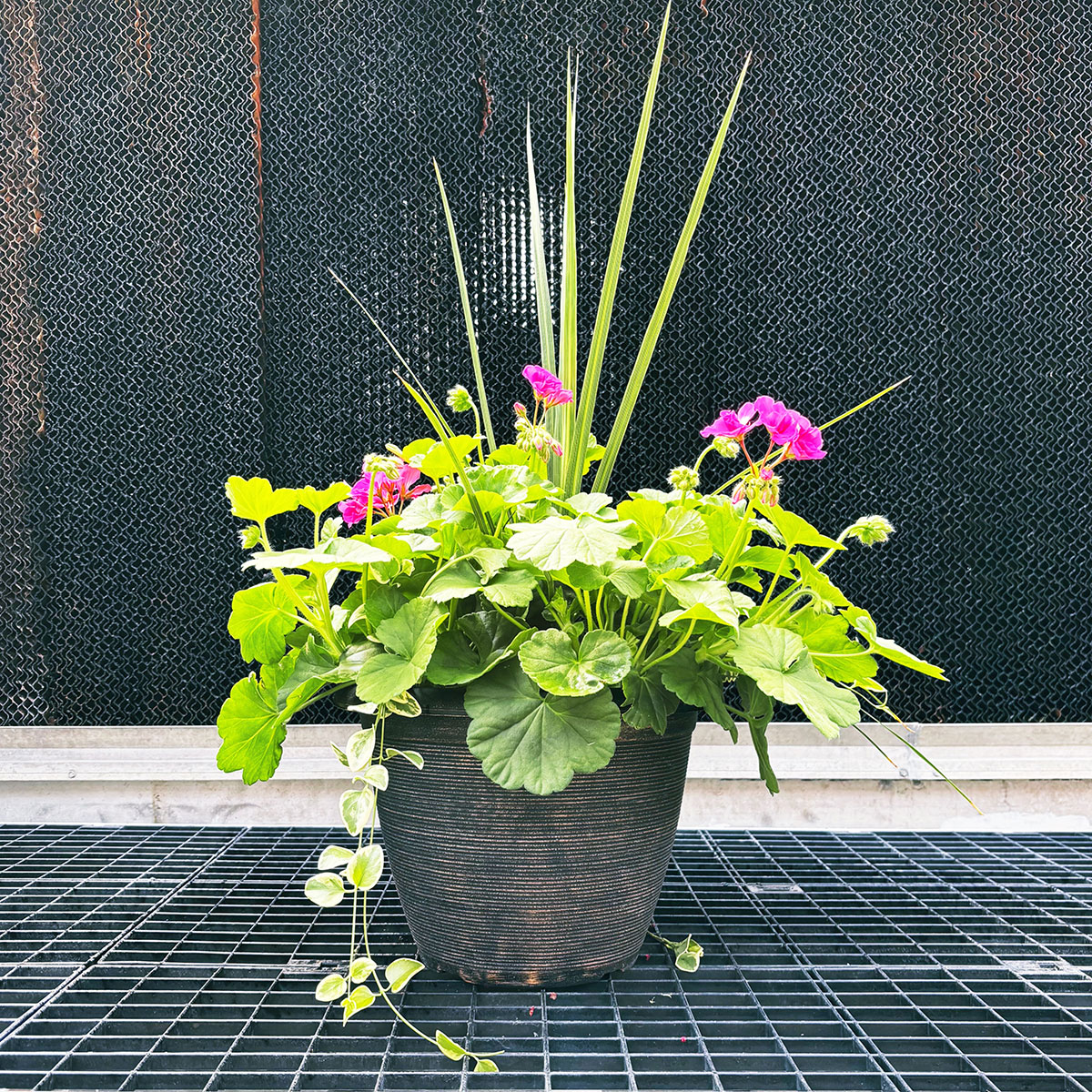 Calliope ‘Large Pink’ is the geranium with the most blossoms. Solid pink blooms don't fade over time with amazing color all summer. The dracaena spike and the variegated vinca vine compliment this combination. Fertilize every two weeks. Remove flowers for neatness.