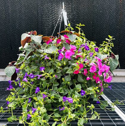Like a dance of color this is our most popular combo basket for shade. It features the bright Impatiens, Lobelia, Vinca Vine and Fuchsia.