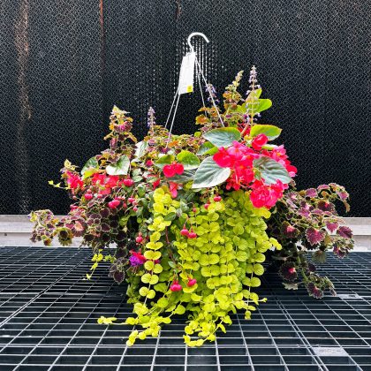 14″ Fiber Hanging Basket for part sun and shade. Bright colors and maintenance free. It includes: Begonia, Coleus, Fuchsia, Lysimachia (Creeping Jenny).