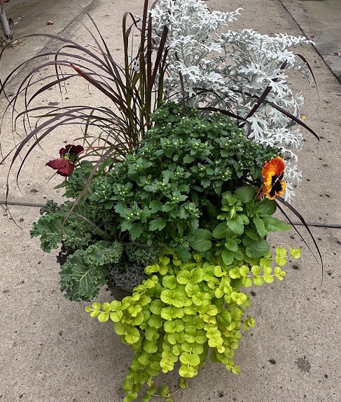 This fall combo includes: Carex ColorGrass® Red Rooster, Dusty Miller Silver Dust, Ornamental Pepper Acapulco™ Orange, Sedum Lemon Ball, Ornamental kale Nagoya Red and a Orange Mum. This bright fall combo will put a smile on your face every time you look at it.