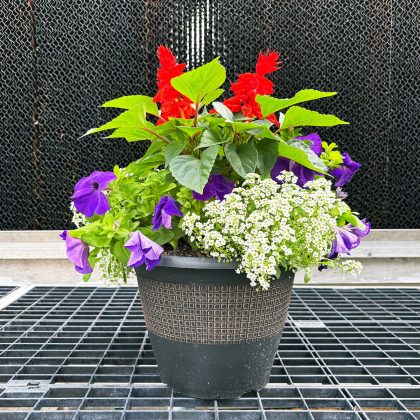This combination is both pretty and durable. It includes: Salvia ‘Vista Red,’ Petunia ‘Pretty Grand Midnight’ (blue) and Alyssum ‘Giga White’.
