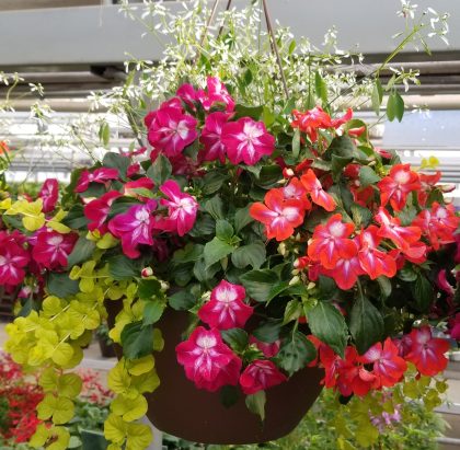 This basket of bright orange and burgundy impatiens is perfect in the shade with a white star in the center of the flowers it will remind you of a shooting comet. To compliment it we have added Euphorbia ‘Glitz’ and the trailing Lysimachia ‘Goldilocks’. It also features Impatiens ‘Patchwork™ Cosmic Orange’ and Impatiens ‘Cosmic Burgundy’in a 12″ chocolate color hanging basket.