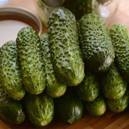 An heirloom favorite from Germany. It produces an abundance of juicy dark green cucumbers. Very crisp.