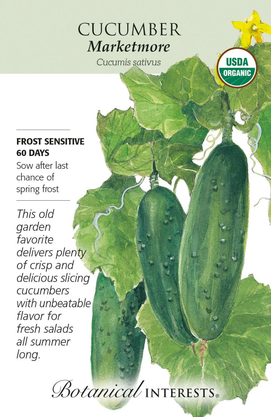 Introduced in 1968 by Cornell University, 'Marketmore' is a beautiful, dark green cucumber that's ready to pick when 6″–8″ long. Fruits keep their size and shape even under poor weather conditions unlike other varieties that may curl and become misshapen. The 4'–6' long vines continue to produce with regular picking. Disease resistant.