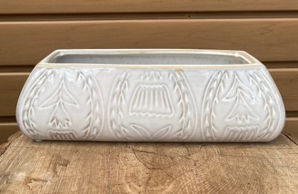 This white stoneware planter measures 9.75 inches across, 3.5 inches wide, and 3 inches tall.