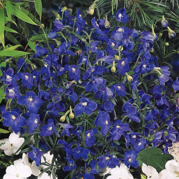 Unlike the tall, spiky Delphinium cultivars, this little plant stands at a height of 10″-12″ and forms compact mounds of well-branched foliage. It puts on a spectacular show from early summer to fall, with satiny midnight blue flowers which cover the lacy leaves.