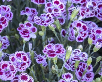Deep shades of magenta surrounded by soft lavender grace the frilly flowers of this sunny perennial. Blooms continuously from early spring until autumn, providing a wonderful spicy clove-like fragrance. Prolific flowers are held on sturdy stems above a tidy, low maintenance mound of silver-green foliage. Great for carefree landscape borders.