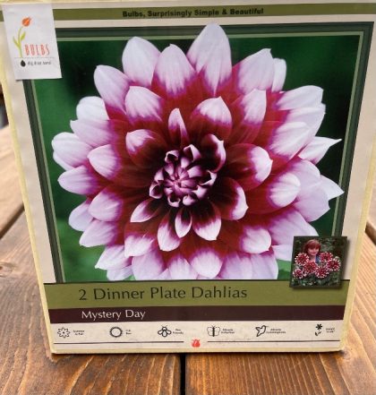 The Dinner Dahlia 'Mystery Day' produces flowers 8-10 inches wide. Should be planted in spring after danger of frost has passed. Plant 1-2 inches deep and space 12-18 inches apart. Can reach 36 inches tall.