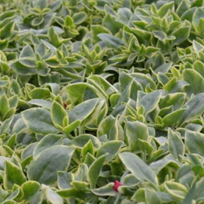 Greyish-green foliage with white variegation. Magenta multi petal small flowers in summer. Succulent, very heat and drought tolerant.