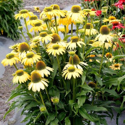 Bright, sunny blooms for easy color from late spring through fall. Semi-double, golden yellow surround showy center cones. A cutting garden essential or mixed perennial borders. Allow dried flower heads to remain on plants for wintering songbirds. An herbaceous perennial.