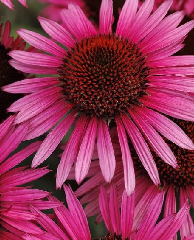 A compact, bushy coneflower with large, toothy, dark green foliage and intensely vibrant flowers on deep red, upright stems. Each large flower features upward and outward-facing magenta-colored petals that perfectly frame its dark orange center. Sturdy, reliable, drought tolerant summer color for beds & borders. An herbaceous perennial.