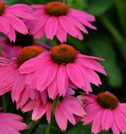 Deep purple-pink to near-magenta flowers with a dark cone measure 3-4” across with wide, overlapping petals.  From early through late summer, the flowers are produced prolifically on stiff, well-branched stems.  More branches result in more flowers per plant and a showier display in the landscape. Drought tolerant once established.