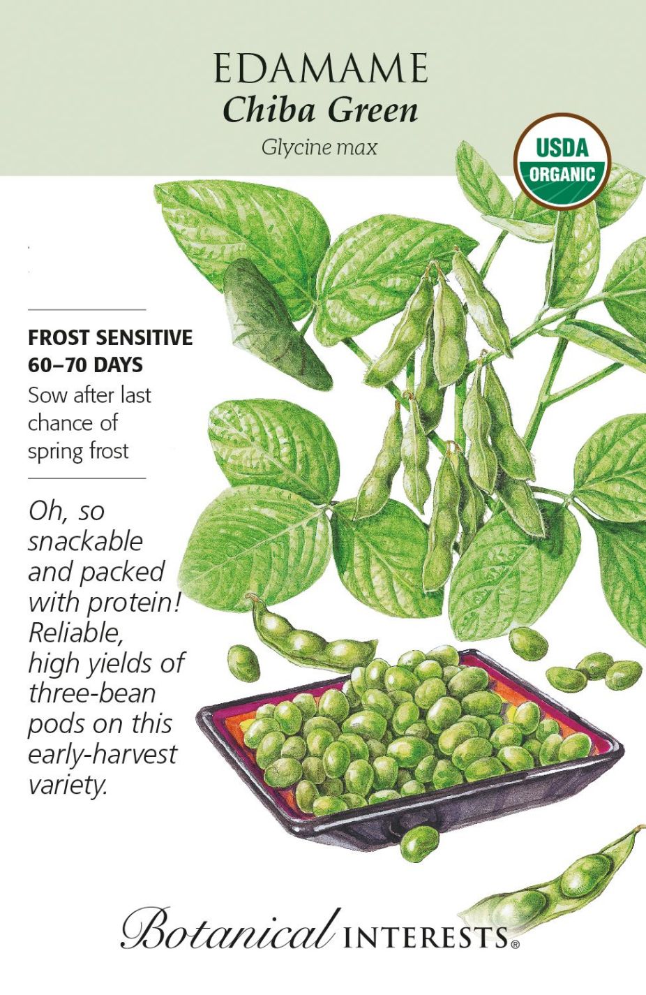 Edamame has been eaten for centuries in Japan. Traditionally, whole pods are blanched and lightly salted, served in a common bowl to be shared with friends. Also Excellent shelled and added to cold or hot pasta dishes or stir-fries. These young, cholesterol-free soybeans are rich in protein, calcium, iron, fiber, and vitamins A, B, and C. 'Chiba Green' grows large, dark green pods with a high percent of three-bean pods. Earlier to harvest than most, and well adapted for any growing area.